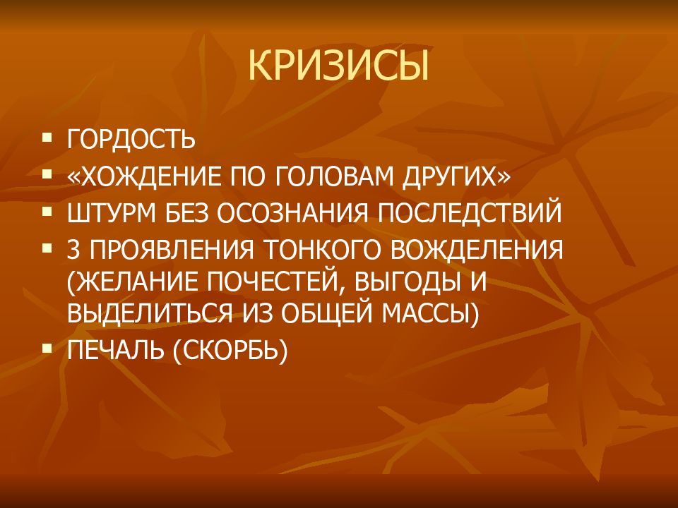 ГОРДОСТЬ «ХОЖДЕНИЕ ПО ГОЛОВАМ ДРУГИХ» ШТУРМ БЕЗ ОСОЗНАНИЯ ПОСЛЕДСТВИЙ 3 ПРОЯВЛЕНИЯ ТОНКОГО ВОЖДЕЛЕНИЯ (ЖЕЛАНИЕ ПОЧЕСТЕЙ, ВЫГОДЫ И ВЫДЕЛИТЬСЯ ИЗ ОБЩЕЙ МАССЫ) ПЕЧАЛЬ (СКОРБЬ)