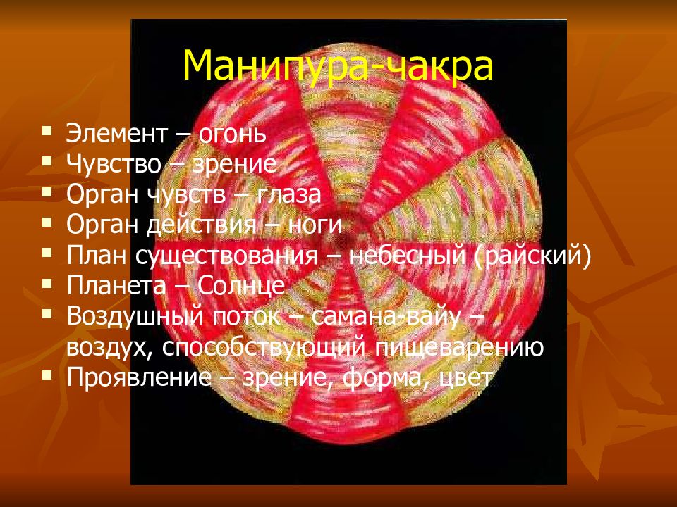 Элемент – огонь Чувство – зрение Орган чувств – глаза Орган действия – ноги План существования – небесный (райский) Планета – Солнце Воздушный поток – самана-вайу – воздух, способствующий пищеварению Проявление – зрение, форма, цвет