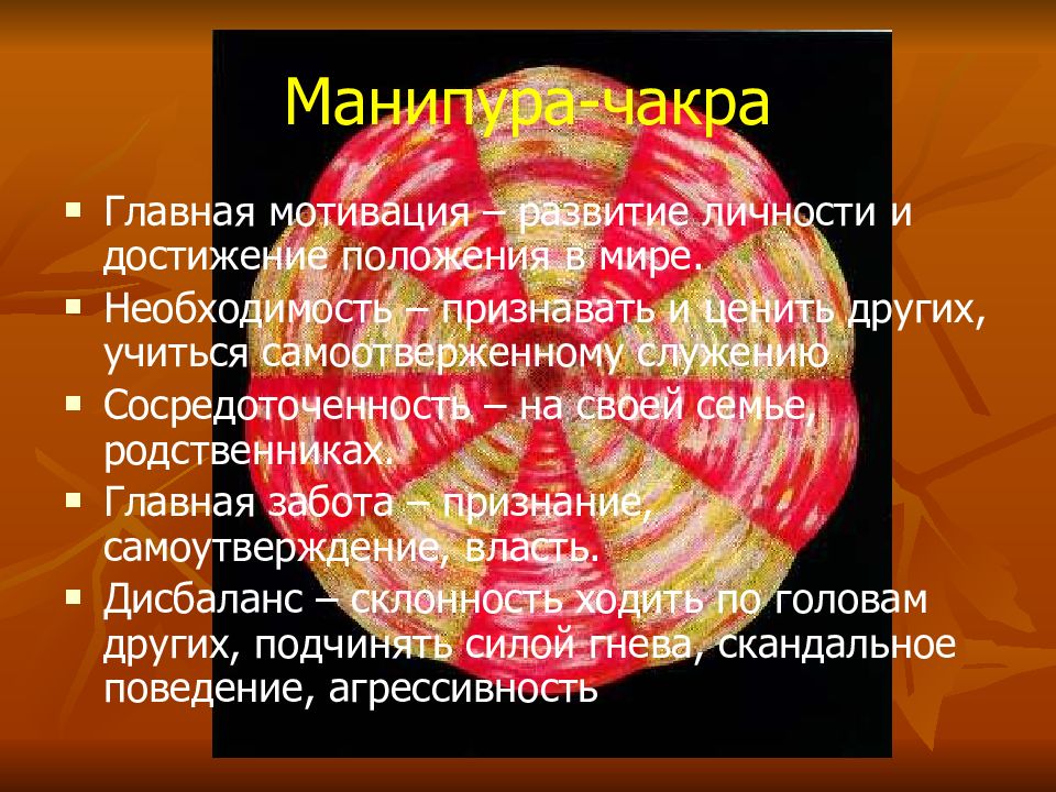 Главная мотивация – развитие личности и достижение положения в мире. Необходимость – признавать и ценить других, учиться самоотверженному служению Сосредоточенность – на своей семье, родственниках. Главная забота – признание, самоутверждение, власть. Дисбаланс – склонность ходить по головам других, подчинять силой гнева, скандальное поведение, агрессивность