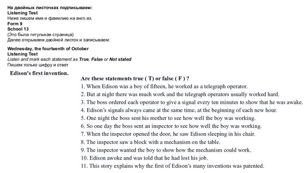 На двойных листочках подписываем: Listening Test Ниже пишем имя и фамилию на англ.яз. Form 9 School 13 (Это была титульная страница) Далее открываем двойной листок и записываем: Wednesday, the fourteenth of October Listening Test Listen and mark each statement as True, False or Not stated Пишем только цифру и ответ Are these statements true ( T) or false ( F ) ? 1. When Edison was a boy of fifteen, he worked as a telegraph operator. 2. But at night there was much work and the telegraph operators usually worked hard. 3. The boss ordered each operator to give a signal every ten minutes to show that he was awake. 4. Edison’s signals always came at the same time, at the beginning of each new hour. 5. One night the boss sent his mother to see how well the boy was working. 6. So one day the boss sent an inspector to see how well the boy was working. 7. When the inspector opened the door, he saw Edison sleeping in his chair. 8. The inspector saw a block with a mechanism on the table. 9. The inspector wanted the boy to show how the mechanism could work. 10. Edison awoke and was told that he had lost his job. 11. This story explains why the first of Edison’s many inventions was patented. Edison's first invention.