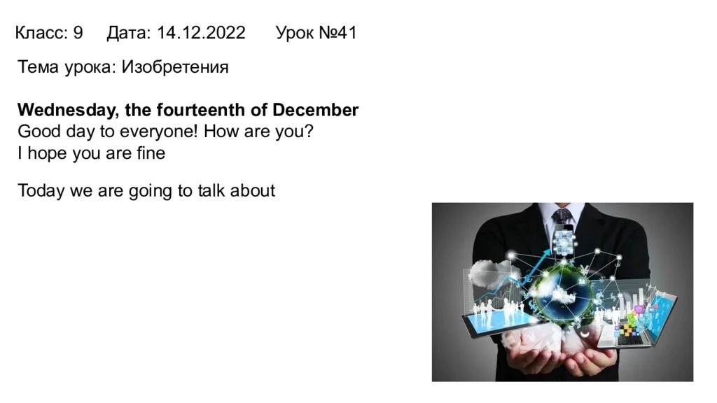 Последний слайд презентации: Класс: 9 Дата: 14. 12.202 2 Урок № 41 Тема урока : Изобретения Wednesday, the