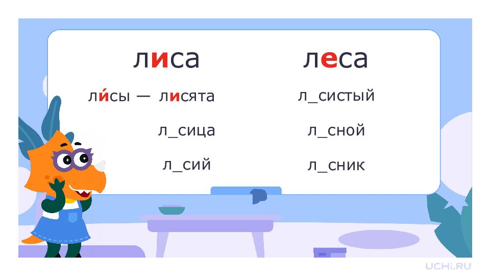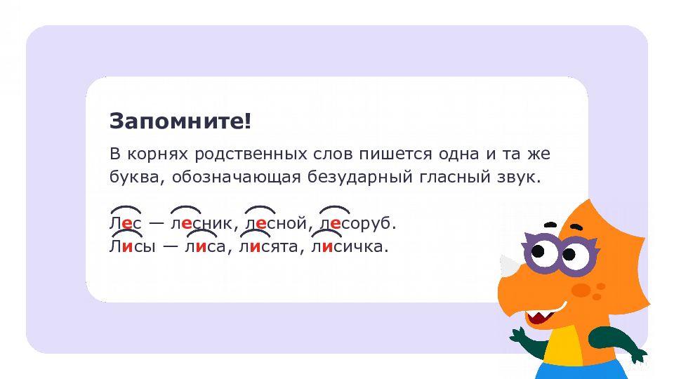 Запомните! В корнях родственных слов пишется одна и та же буква, обозначающая безударный гласный звук. Л е с — л е сник, л е сной, л е соруб. Л и сы — л и са, л и сята, л и сичка.