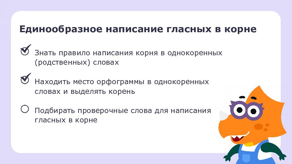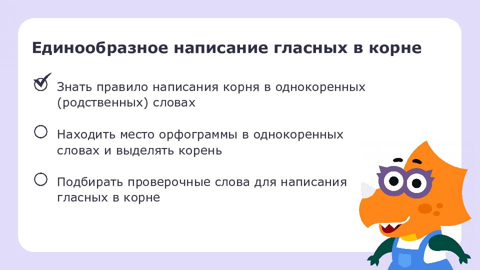 Единообразное написание гласных в корне Знать правило написания корня в однокоренных (родственных) словах Находить место орфограммы в однокоренных словах и выделять корень Подбирать проверочные слова для написания гласных в корне