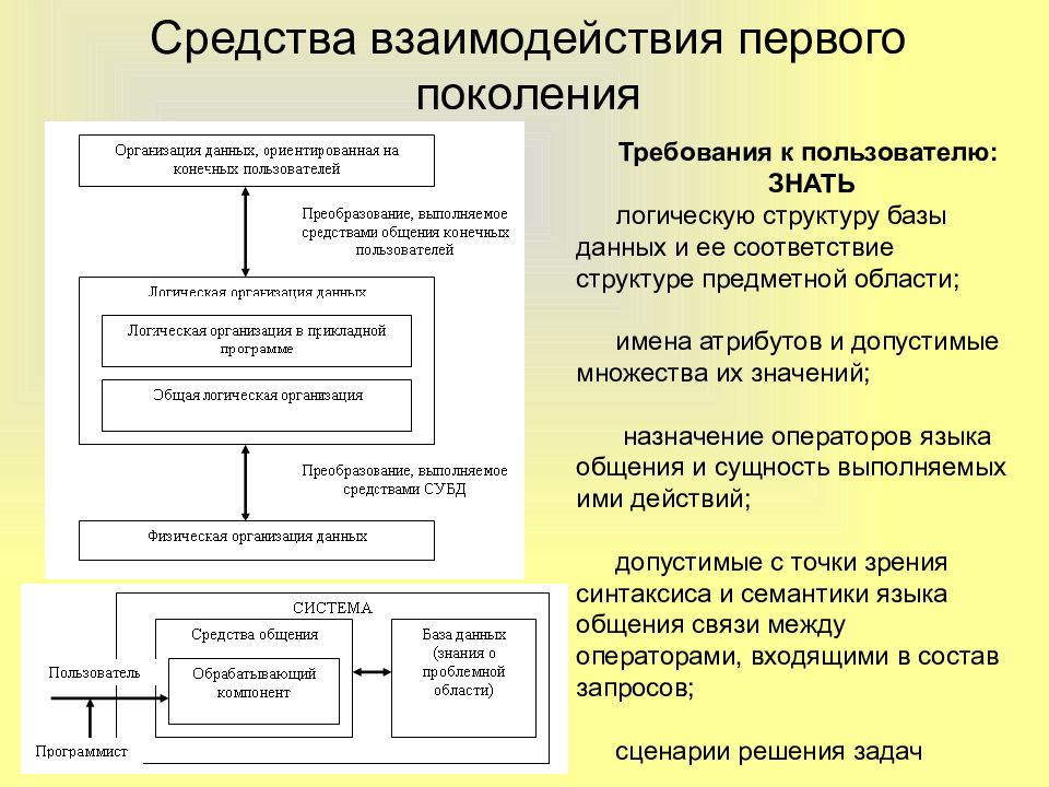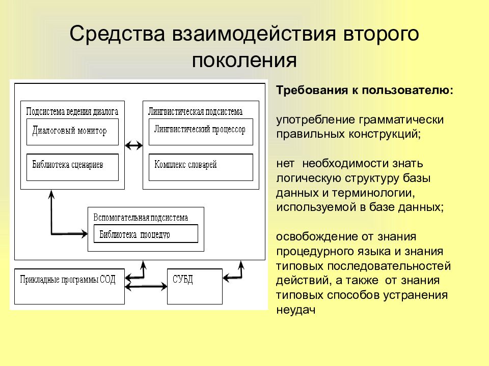Требования к пользователю: употребление грамматически правильных конструкций; нет необходимости знать логическую структуру базы данных и терминологии, используемой в базе данных; освобождение от знания процедурного языка и знания типовых последовательностей действий, а также от знания типовых способов устранения неудач