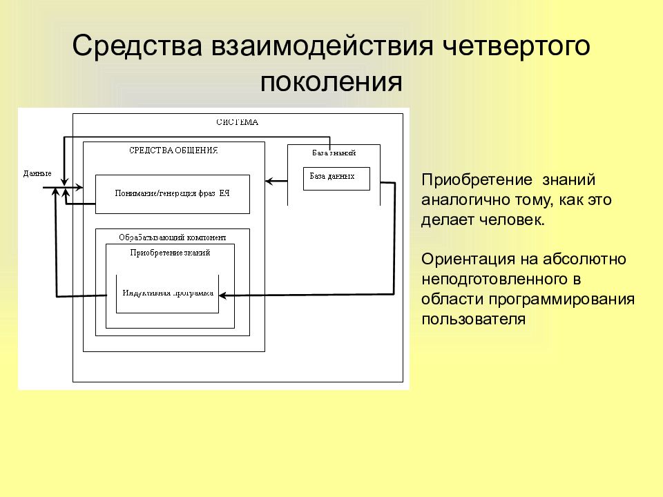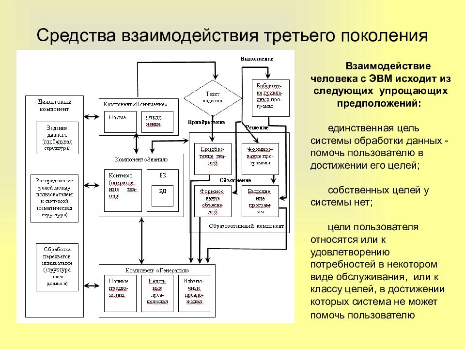 Обрабатывающий компонент средств взаимодействия третьего поколения: формирование процедуры, решающей исходную задачу; объяснение действий или знаний системы; приобретение новых знаний