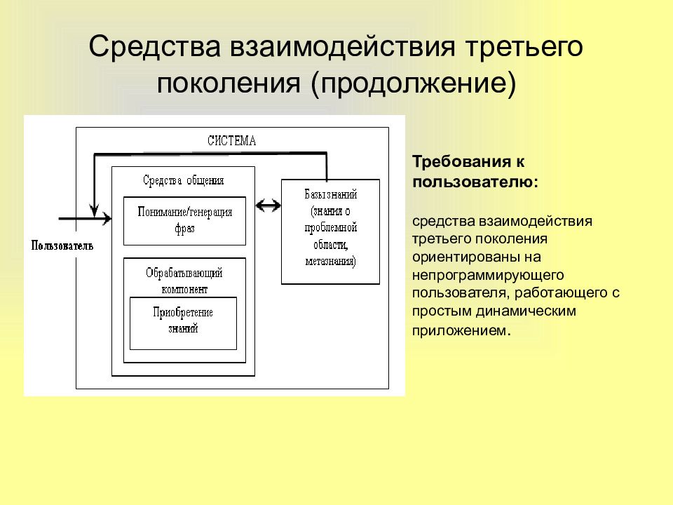 Требования к пользователю: средства взаимодействия третьего поколения ориентированы на непрограммирующего пользователя, работающего с простым динамическим приложением.