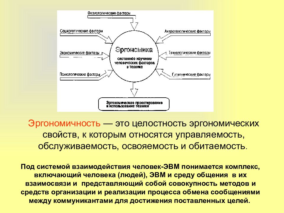 Эргономичность — это целостность эргономических свойств, к которым относятся управляемость, обслуживаемость, освояемость и обитаемость. Под системой взаимодействия человек-ЭВМ понимается комплекс, включающий человека (людей), ЭВМ и среду общения в их взаимосвязи и представляющий собой совокупность методов и средств организации и реализации процесса обмена сообщениями между коммуникантами для достижения поставленных целей.