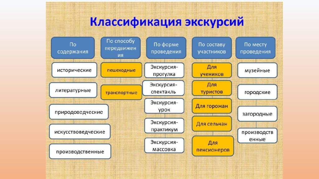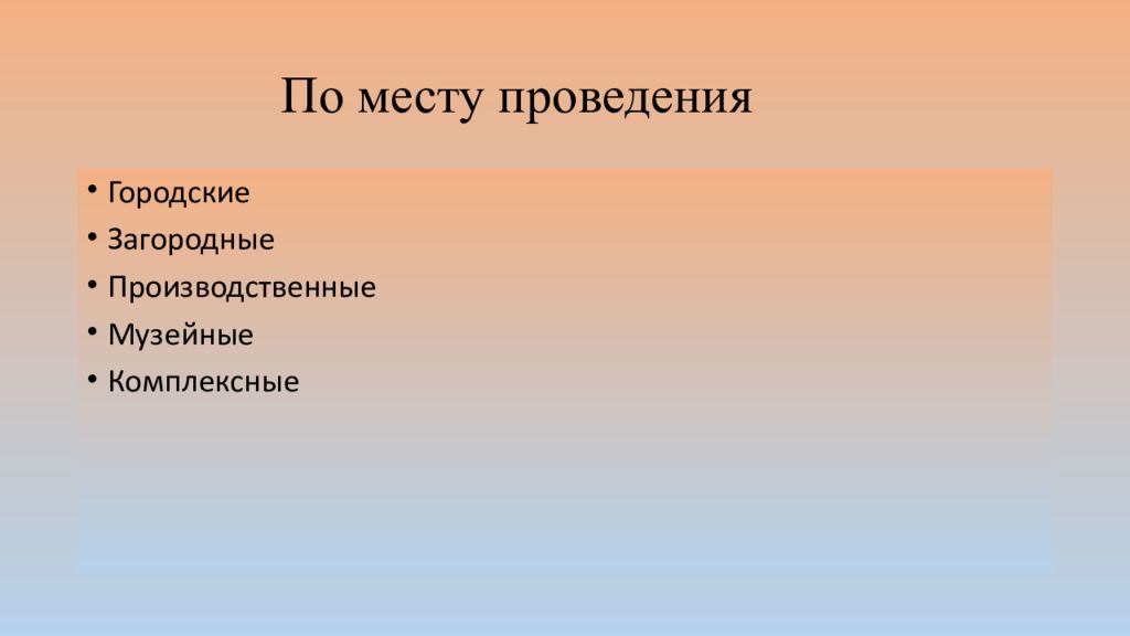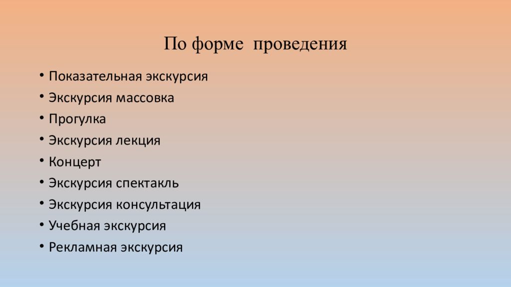 Показательная экскурсия Экскурсия массовка Прогулка Экскурсия лекция Концерт Экскурсия спектакль Экскурсия консультация Учебная экскурсия Рекламная экскурсия