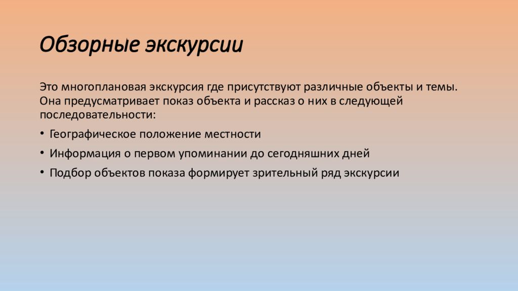 Это многоплановая экскурсия где присутствуют различные объекты и темы. Она предусматривает показ объекта и рассказ о них в следующей последовательности: Географическое положение местности Информация о первом упоминании до сегодняшних дней Подбор объектов показа формирует зрительный ряд экскурсии