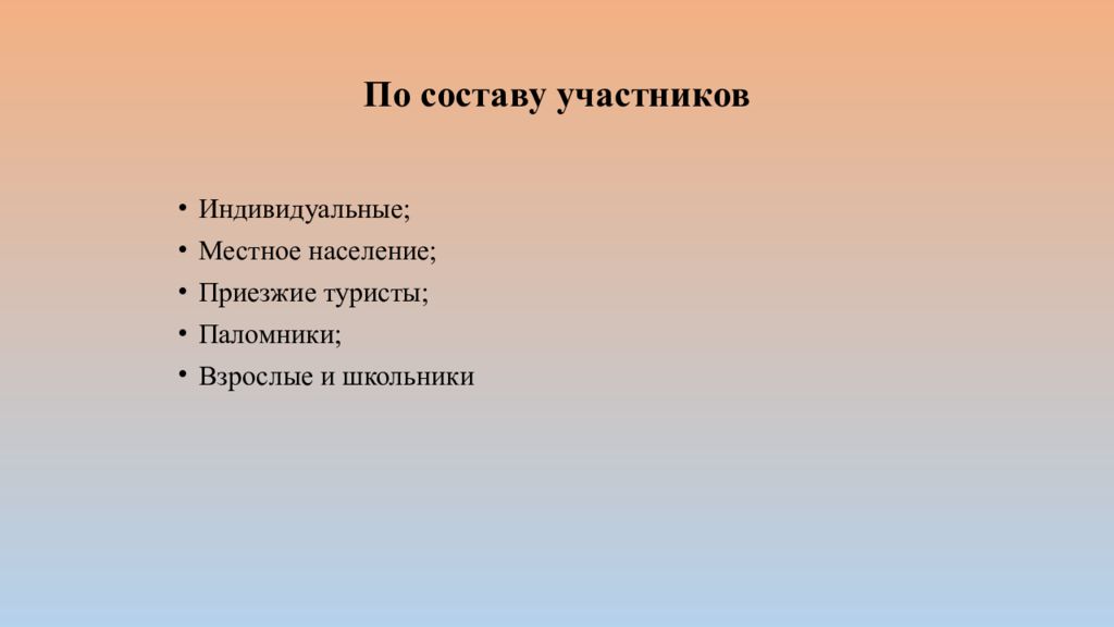 Индивидуальные; Местное население; Приезжие туристы; Паломники; Взрослые и школьники