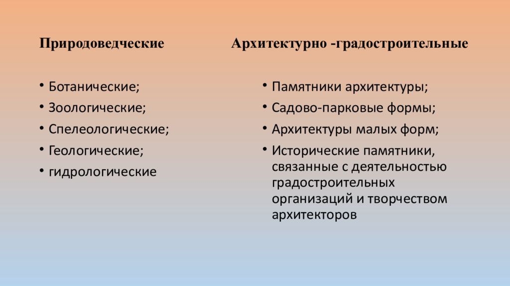 Ботанические; Зоологические; Спелеологические; Геологические; гидрологические Памятники архитектуры; Садово-парковые формы; Архитектуры малых форм; Исторические памятники, связанные с деятельностью градостроительных организаций и творчеством архитекторов