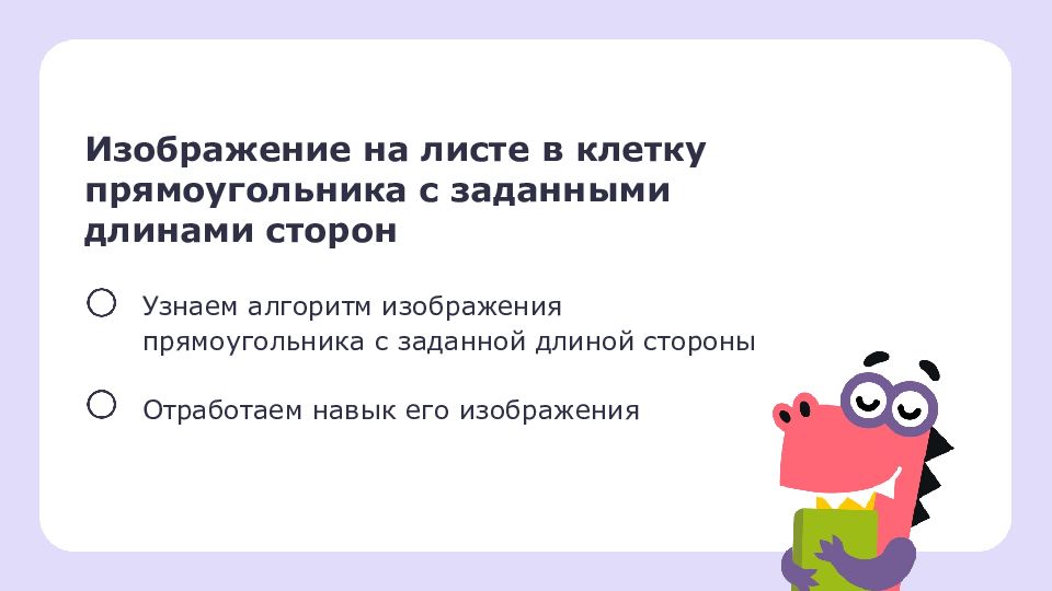 Изображение на листе в клетку прямоугольника с заданными длинами сторон Узнаем алгоритм изображения прямоугольника с заданной длиной стороны Отработаем навык его изображения