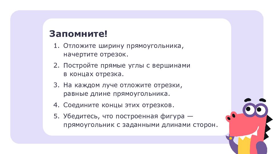 Запомните! Отложите ширину прямоугольника, начертите отрезок. Постройте прямые углы с вершинами в концах отрезка. На каждом луче отложите отрезки, равные длине прямоугольника. Соедините концы этих отрезков. Убедитесь, что построенная фигура — прямоугольник с заданными длинами сторон.