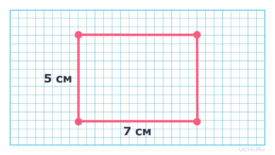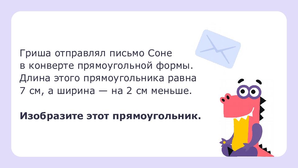 Гриша отправлял письмо Соне в конверте прямоугольной формы. Длина этого прямоугольника равна 7 см, а ширина — на 2 см меньше. Изобразите этот прямоугольник.