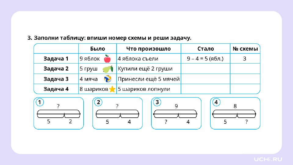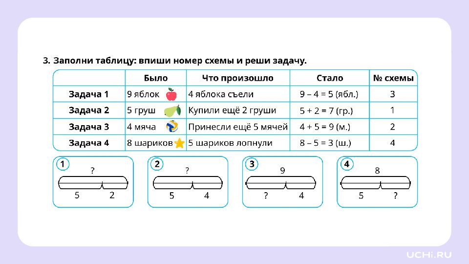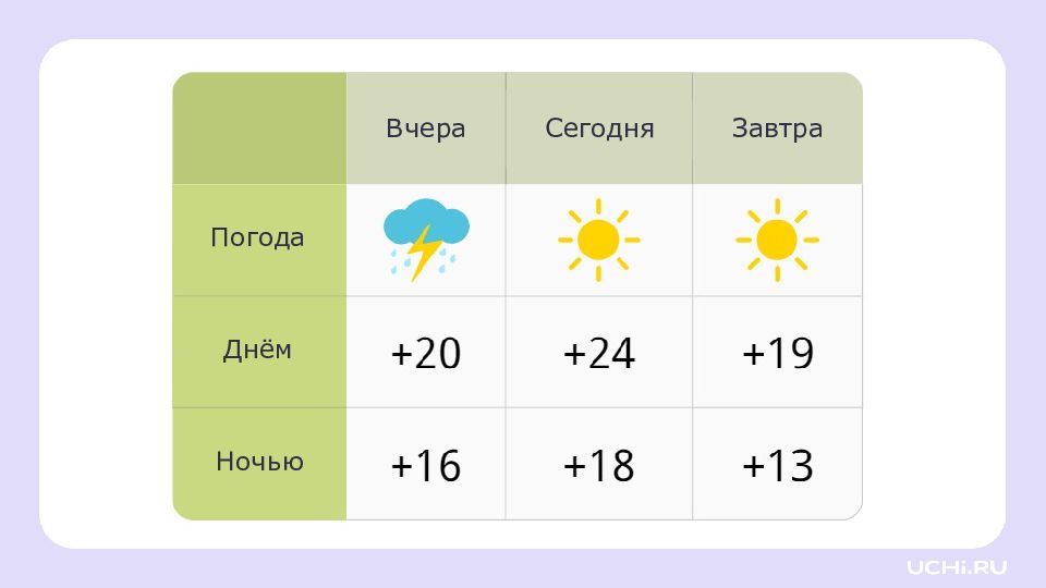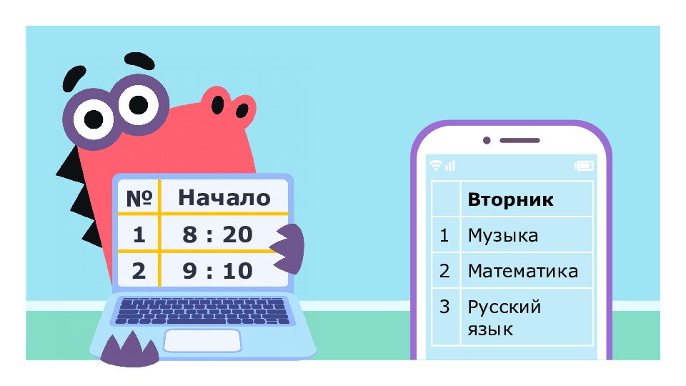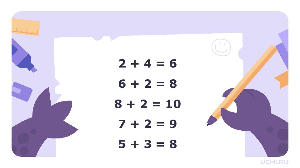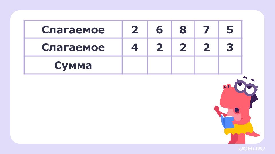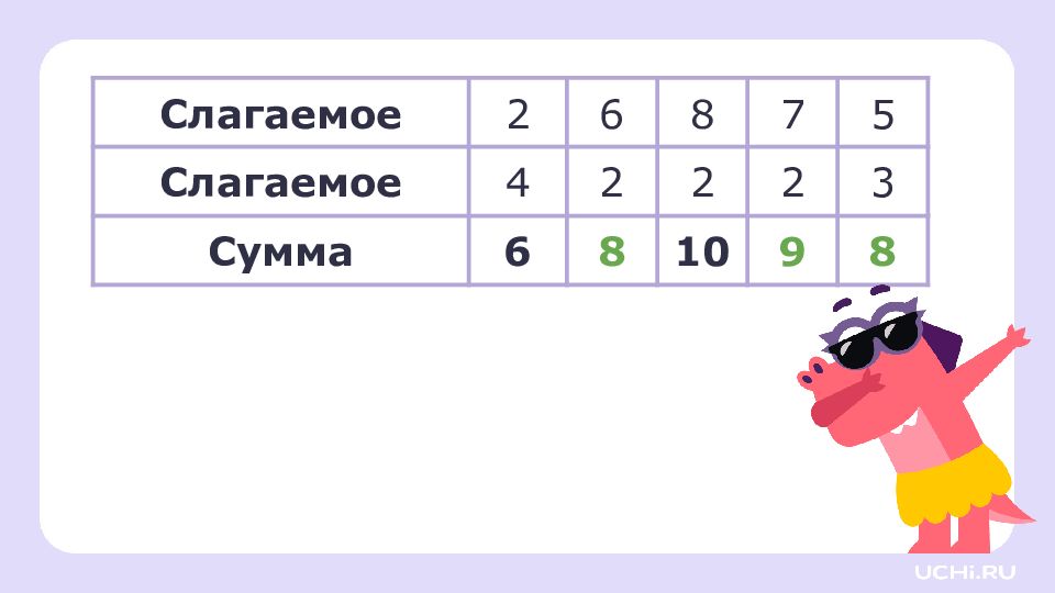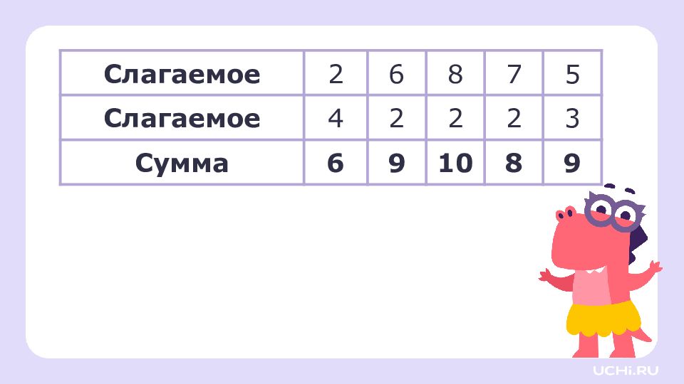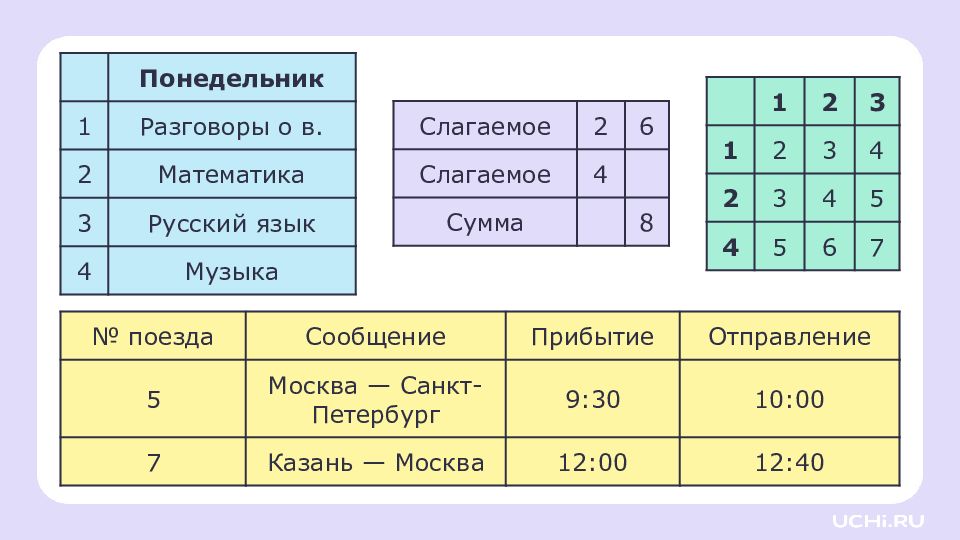 Понедельник 1 Разговоры о в. 2 Математика 3 Русский язык 4 Музыка № поезда Сообщение Прибытие Отправление 5 Москва — Санкт-Петербург 9:30 10:00 7 Казань — Москва 12:00 12:40 Слагаемое 2 6 Слагаемое 4 Сумма 8 1 2 3 1 2 3 4 2 3 4 5 4 5 6 7