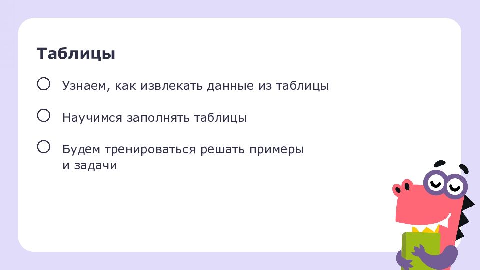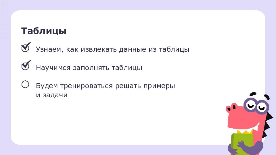 Таблицы Узнаем, как извлекать данные из таблицы Научимся заполнять таблицы Будем тренироваться решать примеры и задачи