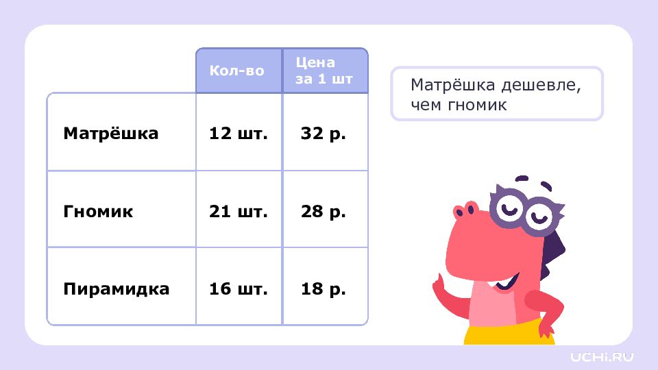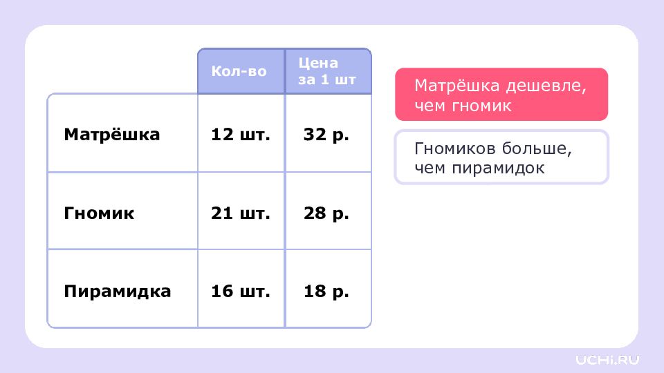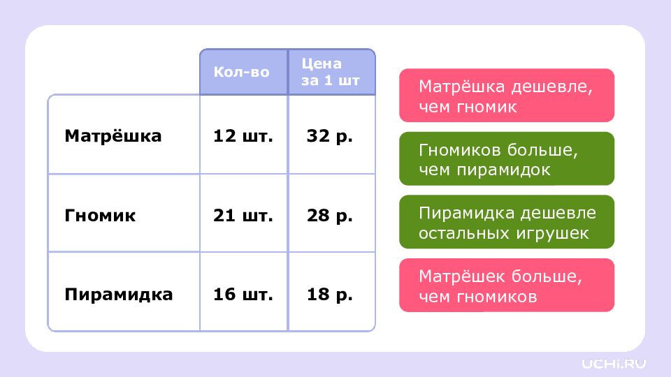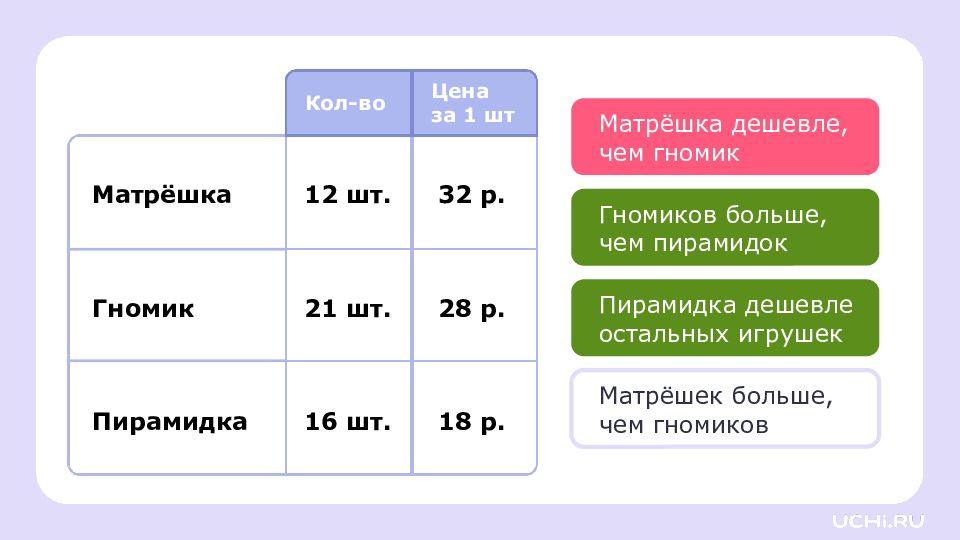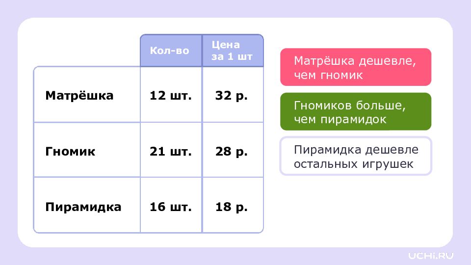 Матрёшка Гномик Пирамидка Кол-во Цена за 1 шт 12 шт. 21 шт. 16 шт. 32 р. 28 р. 18 р. Матрёшек больше, чем гномиков Матрёшка дешевле, чем гномик Гномиков больше, чем пирамидок Пирамидка дешевле остальных игрушек