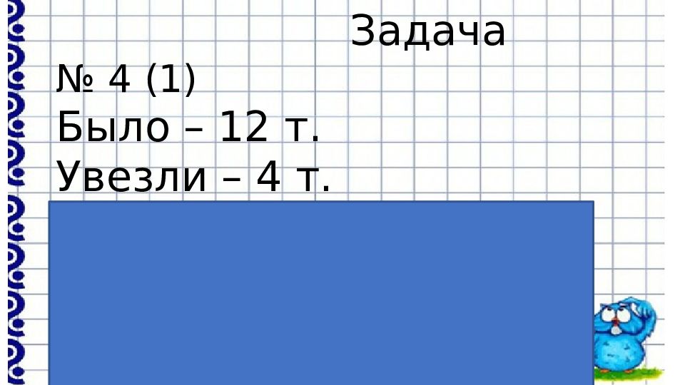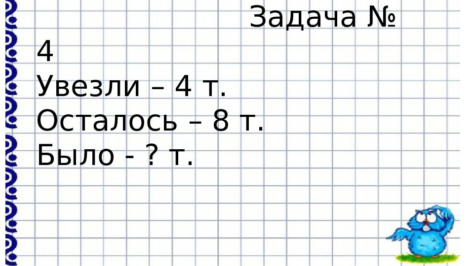 Задача № 4 (1) Было – 12 т. Увезли – 4 т. Осталось – ? т. Задача № 4 (2) Было – 12 т. Увезли – ? т. Осталось – 8 т.