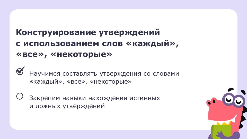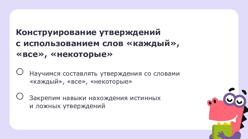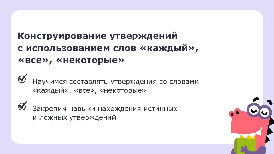 Конструирование утверждений с использованием слов «каждый», «все», «некоторые» Научимся составлять утверждения со словами «каждый», «все», «некоторые» Закрепим навыки нахождения истинных и ложных утверждений