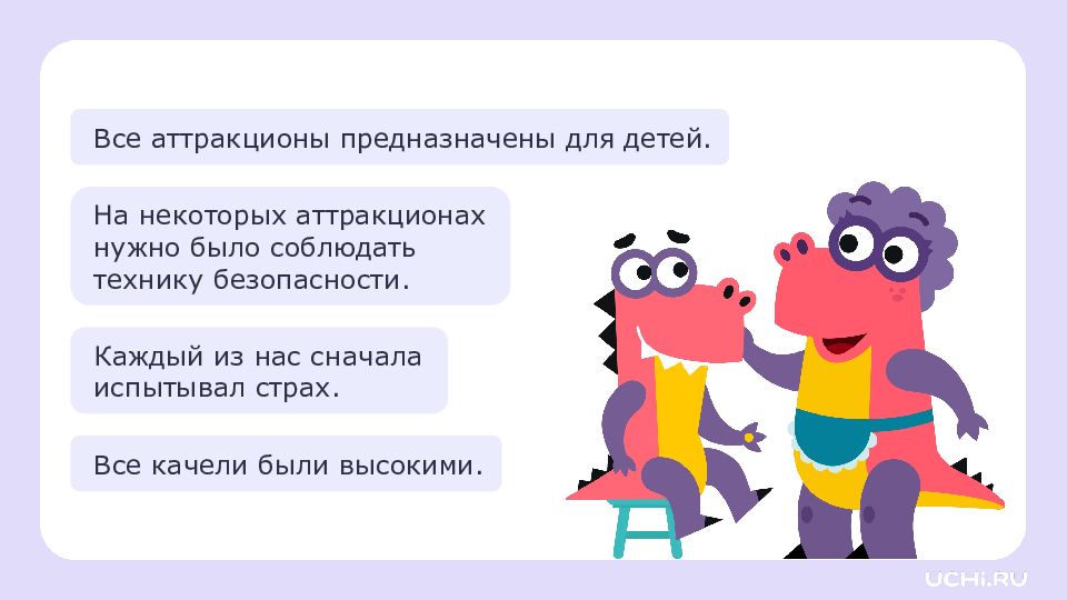 На некоторых аттракционах нужно было соблюдать технику безопасности. Все качели были высокими. Каждый из нас сначала испытывал страх. Все аттракционы предназначены для детей.