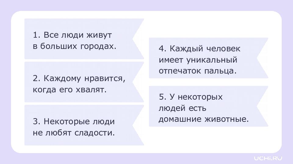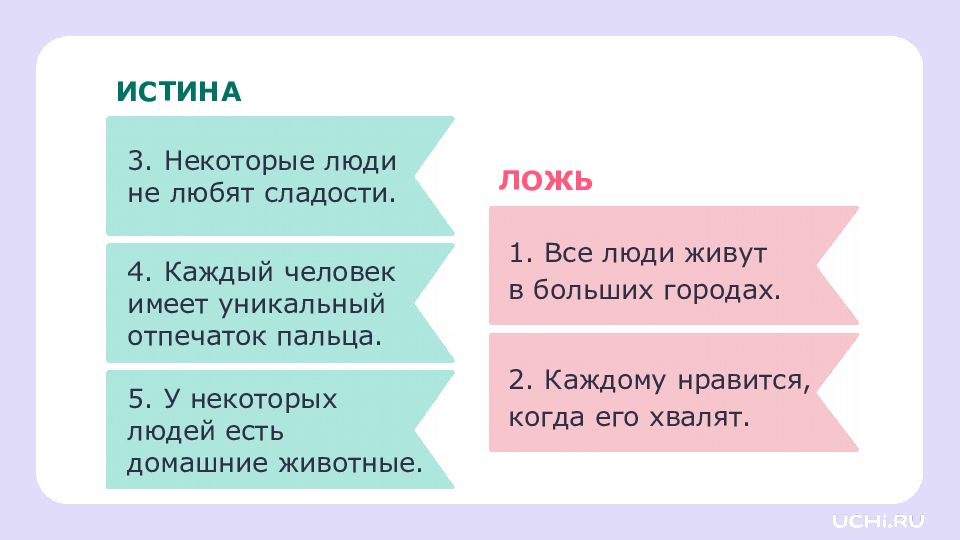 ЛОЖЬ 1. Все люди живут в больших городах. 2. Каждому нравится, когда его хвалят. 4. Каждый человек имеет уникальный отпечаток пальца. 3. Некоторые люди не любят сладости. 5. У некоторых людей есть домашние животные. ИСТИНА