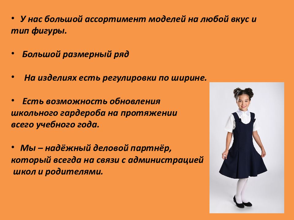 У нас большой ассортимент моделей на любой вкус и тип фигуры. Большой размерный ряд На изделиях есть регулировки по ширине. Есть возможность обновления ш кольного гардероба на протяжении всего учебного года. Мы – надёжный деловой партнёр, который всегда на связи с администрацией школ и родителями.
