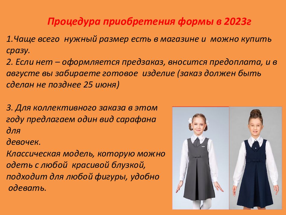1.Чаще всего нужный размер есть в магазине и можно купить сразу. 2. Если нет – оформляется предзаказ, вносится предоплата, и в августе вы забираете готовое изделие (заказ должен быть сделан не позднее 25 июня) 3. Для коллективного заказа в этом году предлагаем один вид сарафана для девочек. Классическая модель, которую можно одеть с любой красивой блузкой, подходит для любой фигуры, удобно одевать. Процедура приобретения формы в 2023г