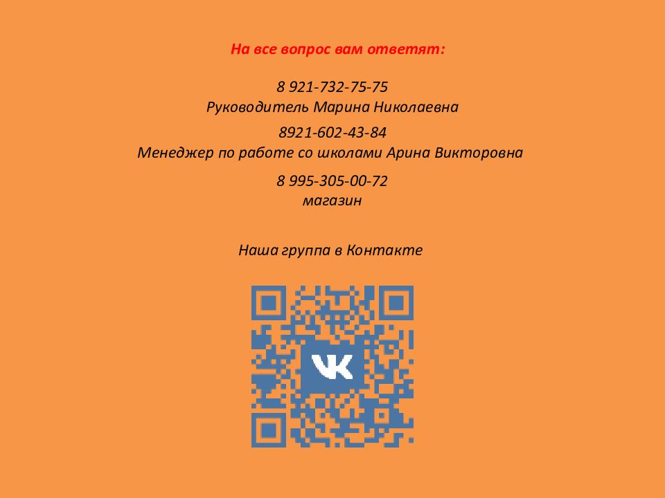 Наша группа в Контакте На все вопрос вам ответят: 8 921-732-75-75 Руководитель Марина Николаевна 8 995-305-00-72 магазин 8921-602-43-84 Менеджер по работе со школами Арина Викторовна