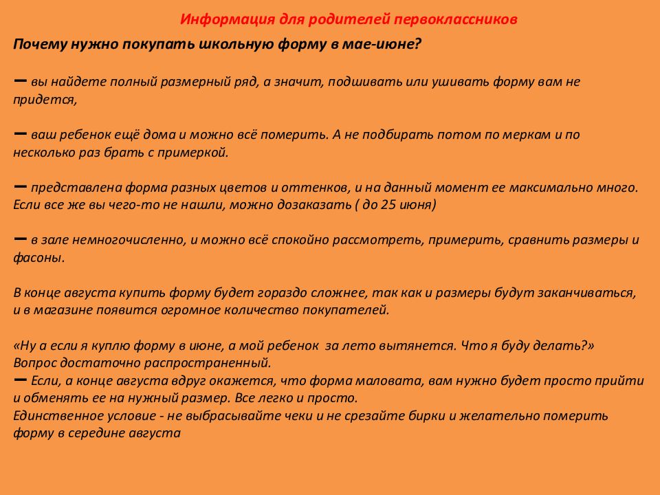 Информация для родителей первоклассников Почему нужно покупать школьную форму в мае-июне? ➖ вы найдете полный размерный ряд, а значит, подшивать или ушивать форму вам не придется, ➖ ваш ребенок ещё дома и можно всё померить. А не подбирать потом по меркам и по несколько раз брать с примеркой. ➖ представлена форма разных цветов и оттенков, и на данный момент ее максимально много. Если все же вы чего-то не нашли, можно дозаказать ( до 2 5 июня) ➖ в зале немногочисленно, и можно всё спокойно рассмотреть, примерить, сравнить размеры и фасоны. В конце августа купить форму будет гораздо сложнее, так как и размеры будут заканчиваться, и в магазине появится огромное количество покупателей. «Ну а если я куплю форму в июне, а мой ребенок за лето вытянется. Что я буду делать ?» Вопрос достаточно распространенный. ➖ Если, а конце августа вдруг окажется, что форма маловата, вам нужно будет просто прийти и обменять ее на нужный размер. Все легко и просто. Единственное условие - не выбрасывайте чеки и не срезайте бирки и желательно померить форму в середине августа