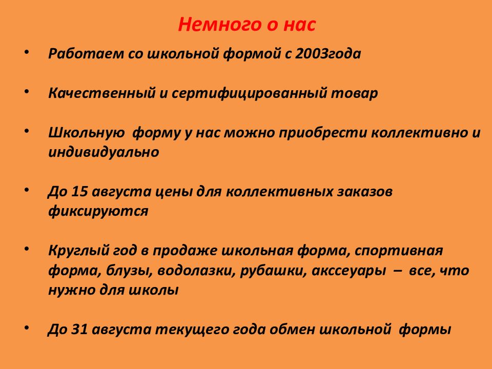 Работаем со школьной формой с 2003года Качественный и сертифицированный товар Школьную форму у нас можно приобрести коллективно и индивидуально До 15 августа цены для коллективных заказов фиксируются Круглый год в продаже школьная форма, спортивная форма, блузы, водолазки, рубашки, акссеуары – все, что нужно для школы До 31 августа текущего года обмен школьной формы Немного о нас
