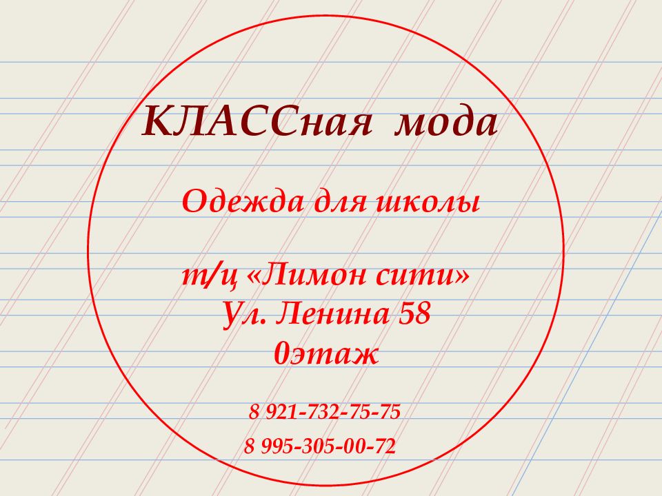 КЛАССная мода Одежда для школы т/ц «Лимон сити» Ул. Ленина 58 0этаж 8 921-732-75-75 8 995-305-00-72