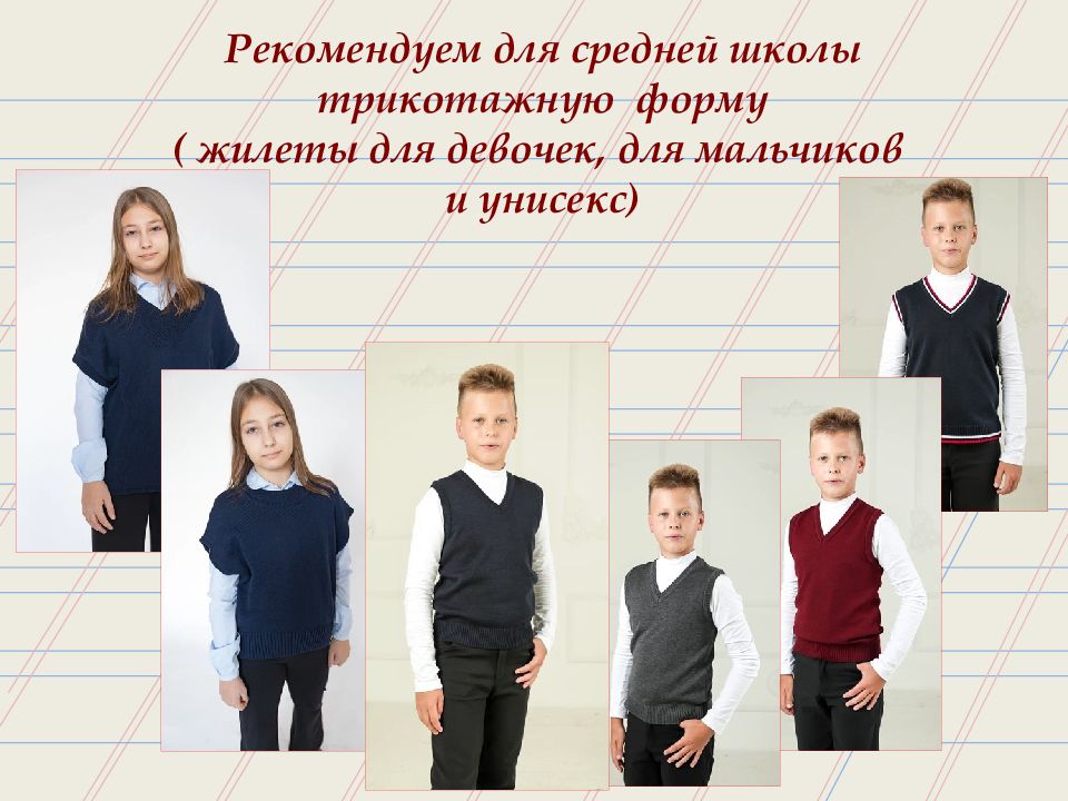 Рекомендуем для средней школы трикотажную форму ( жилеты для девочек, для мальчиков и унисекс)