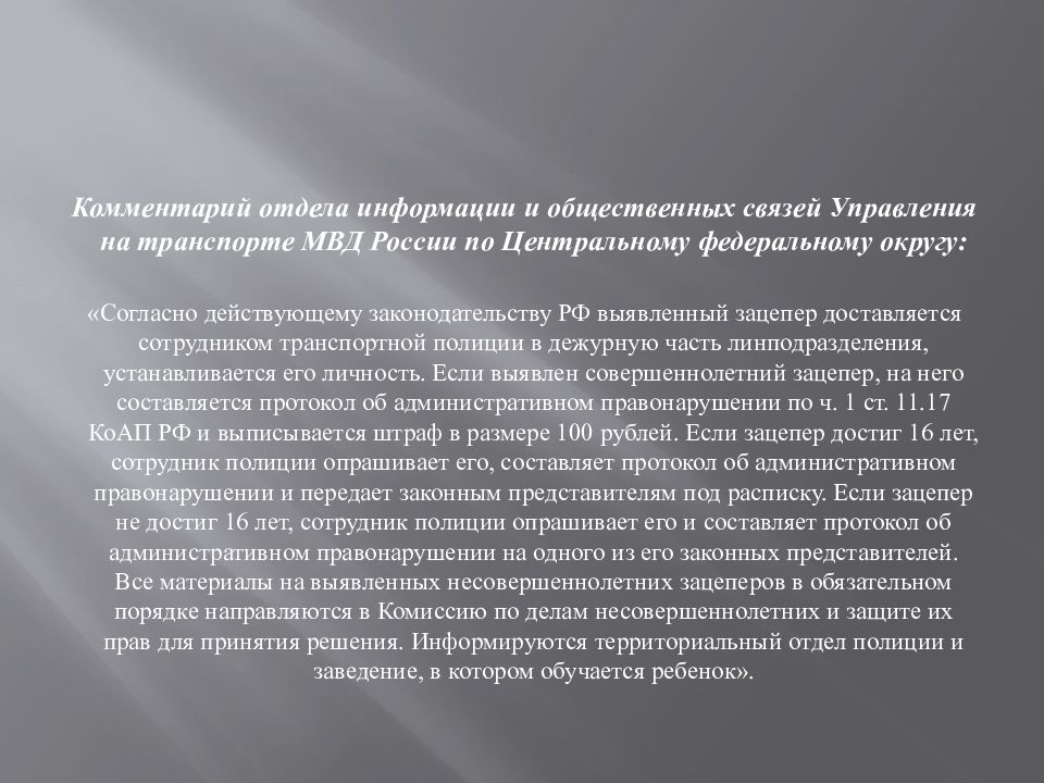 Комментарий отдела информации и общественных связей Управления на транспорте МВД России по Центральному федеральному округу: «Согласно действующему законодательству РФ выявленный зацепер доставляется сотрудником транспортной полиции в дежурную часть линподразделения, устанавливается его личность. Если выявлен совершеннолетний зацепер, на него составляется протокол об административном правонарушении по ч. 1 ст. 11.17 КоАП РФ и выписывается штраф в размере 100 рублей. Если зацепер достиг 16 лет, сотрудник полиции опрашивает его, составляет протокол об административном правонарушении и передает законным представителям под расписку. Если зацепер не достиг 16 лет, сотрудник полиции опрашивает его и составляет протокол об административном правонарушении на одного из его законных представителей. Все материалы на выявленных несовершеннолетних зацеперов в обязательном порядке направляются в Комиссию по делам несовершеннолетних и защите их прав для принятия решения. Информируются территориальный отдел полиции и заведение, в котором обучается ребенок».