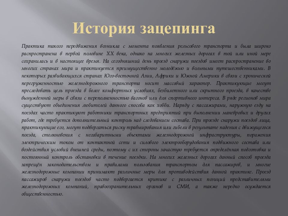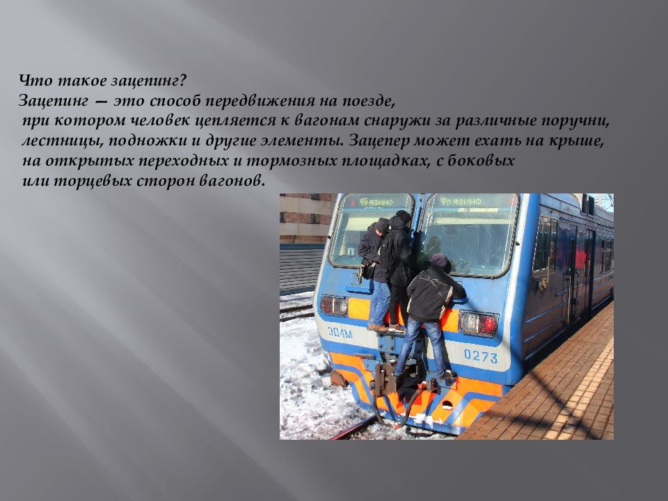 Что такое зацепинг? Зацепинг — это способ передвижения на поезде, при котором человек цепляется к вагонам снаружи за различные поручни, лестницы, подножки и другие элементы. Зацепер может ехать на крыше, на открытых переходных и тормозных площадках, с боковых или торцевых сторон вагонов.