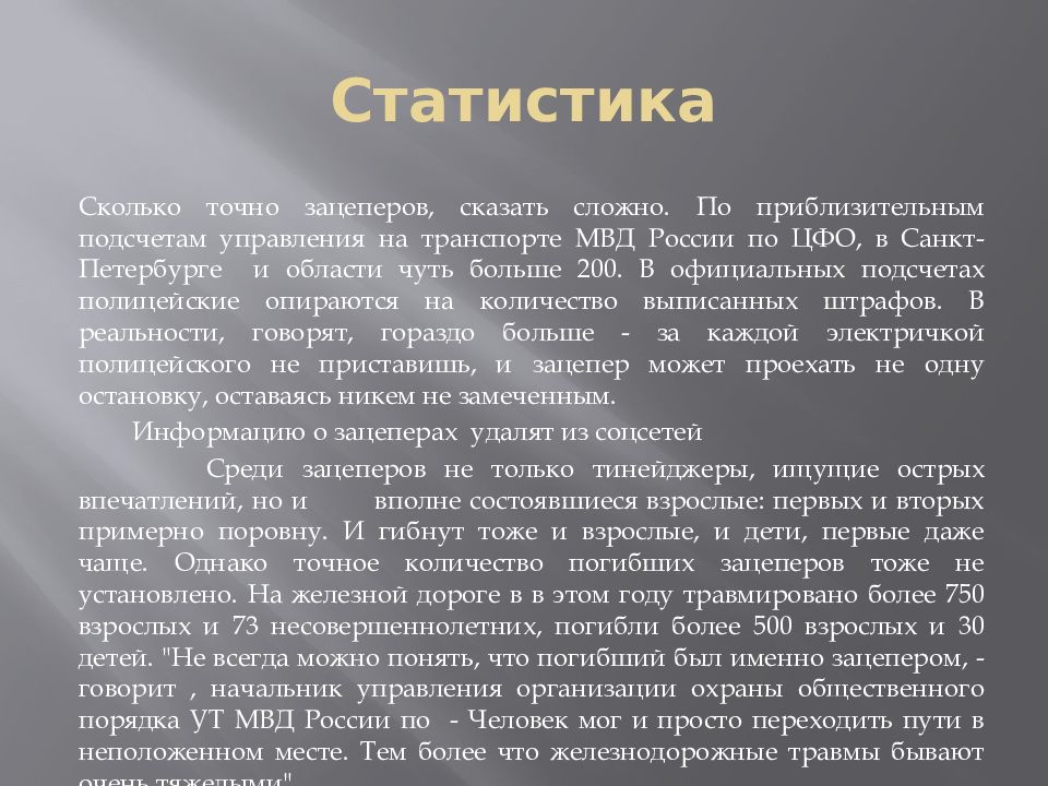 Сколько точно зацеперов, сказать сложно. По приблизительным подсчетам управления на транспорте МВД России по ЦФО, в Санкт- Петербурге и области чуть больше 200. В официальных подсчетах полицейские опираются на количество выписанных штрафов. В реальности, говорят, гораздо больше - за каждой электричкой полицейского не приставишь, и зацепер может проехать не одну остановку, оставаясь никем не замеченным. Информацию о зацеперах удалят из соцсетей Среди зацеперов не только тинейджеры, ищущие острых впечатлений, но и вполне состоявшиеся взрослые: первых и вторых примерно поровну. И гибнут тоже и взрослые, и дети, первые даже чаще. Однако точное количество погибших зацеперов тоже не установлено. На железной дороге в в этом году травмировано более 750 взрослых и 73 несовершеннолетних, погибли более 500 взрослых и 30 детей. "Не всегда можно понять, что погибший был именно зацепером, - говорит, начальник управления организации охраны общественного порядка УТ МВД России по - Человек мог и просто переходить пути в неположенном месте. Тем более что железнодорожные травмы бывают очень тяжелыми".