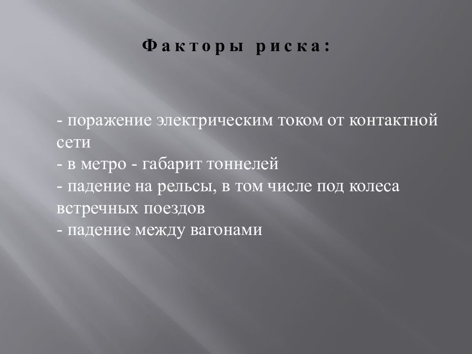 - поражение электрическим током от контактной сети - в метро - габарит тоннелей - падение на рельсы, в том числе под колеса встречных поездов - падение между вагонами Факторы риска :