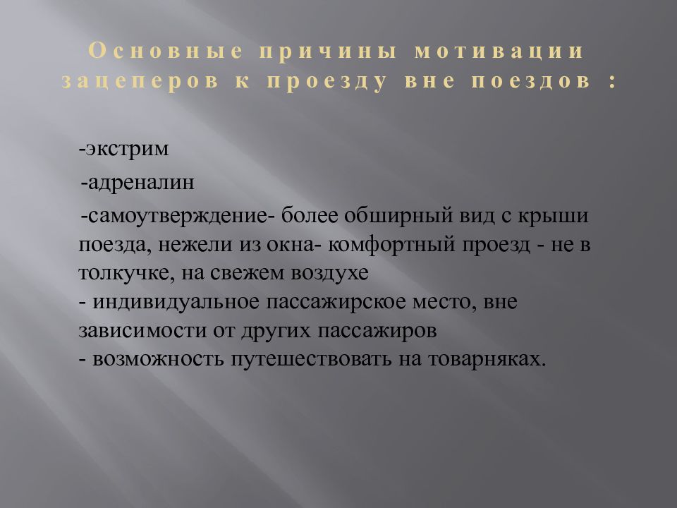 Слайд 5: Основные причины мотивации зацеперов к проезду вне поездов :