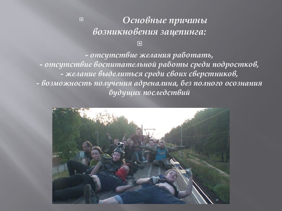 Основные причины возникновения зацепинга : - отсутствие желания работать, - отсутствие воспитательной работы среди подростков, - желание выделиться среди своих сверстников, - возможность получения адреналина, без полного осознания будущих последствий