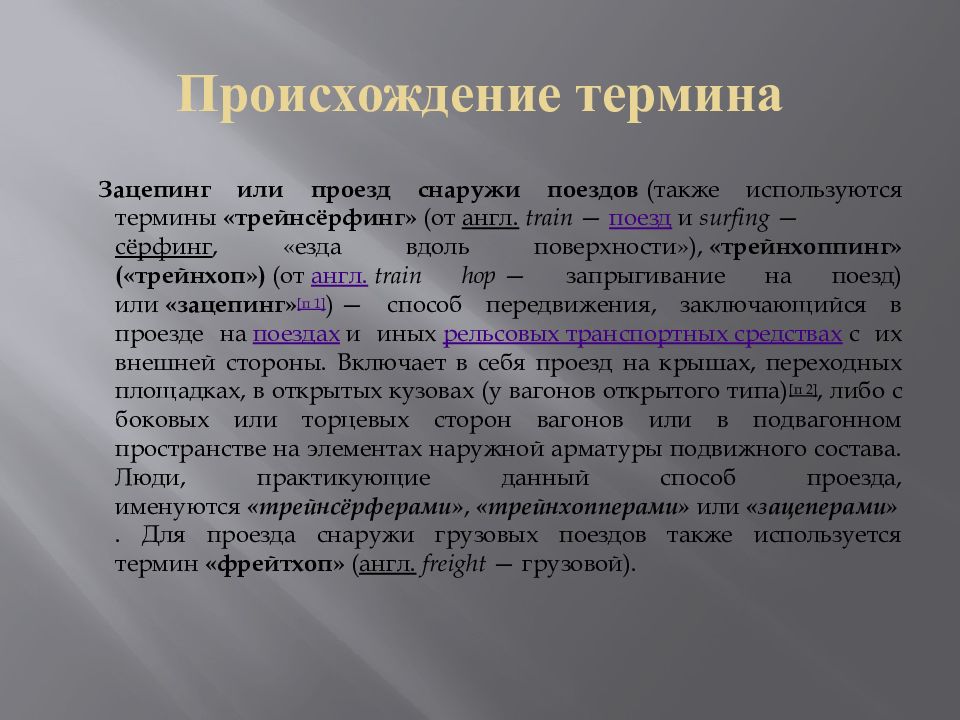 Зацепинг или проезд снаружи поездов (также используются термины « трейнсёрфинг » (от англ. train — поезд и surfing — сёрфинг, «езда вдоль поверхности»), « трейнхоппинг » (« трейнхоп ») (от англ. train hop — запрыгивание на поезд) или «зацепинг» [п 1] ) — способ передвижения, заключающийся в проезде на поездах и иных рельсовых транспортных средствах с их внешней стороны. Включает в себя проезд на крышах, переходных площадках, в открытых кузовах (у вагонов открытого типа) [п 2], либо с боковых или торцевых сторон вагонов или в подвагонном пространстве на элементах наружной арматуры подвижного состава. Люди, практикующие данный способ проезда, именуются « трейнсёрферами », « трейнхопперами » или « зацеперами ». Для проезда снаружи грузовых поездов также используется термин « фрейтхоп » ( англ. freight — грузовой).
