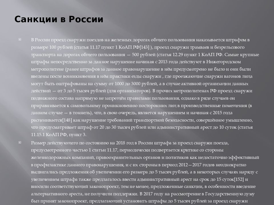 В России проезд снаружи поездов на железных дорогах общего пользования наказывается штрафом в размере 100 рублей (статья 11.17 пункт 1 КоАП РФ[143] ), проезд снаружи трамваев и безрельсового транспорта на дорогах общего пользования — 500 рублей (статья 12.29 пункт 1 КоАП РФ. Самые крупные штрафы непосредственно за данное нарушение начиная с 2013 года действуют в Нижегородском метрополитене (ранее штрафов за данное правонарушение в нём предусмотрено не было и они были введены после возникновения в нём практики езды снаружи, где проезжающие снаружи вагонов лица могут быть оштрафованы на сумму от 1000 до 3000 рублей, а в случае активной организации данных действий — от 3 до 5 тысяч рублей (для организаторов ). В прочих метрополитенах РФ проезд снаружи подвижного состава напрямую не запрещён правилами пользования, однако в ряде случаев он приравнивается к самовольному проникновению посторонних лиц в производственные помещения (в данном случае — в тоннель), что, в свою очередь, является нарушением и начиная с 2015 года расценивается[148] как нарушение требований транспортной безопасности, совершённое умышленно, что предусматривает штраф от 20 до 30 тысяч рублей или административный арест до 10 суток (статья 11.15.1 КоАП РФ, пункт 3. Размер действующего по состоянию на 2018 год в России штрафа за проезд снаружи поезда, предусмотренного частью 1 статьи 11.17, периодически подвергается критике со стороны железнодорожных компаний, правоохранительных органов и политиков как недостаточно эффективный в профилактике данного правонарушения, и с их стороны в период 2012—2017 годов неоднократно выдвигались предложения об увеличении его размера до 5 тысяч рублей, а в некоторых случаях наряду с увеличением штрафа также предлагалось ввести административный арест на срок до 15 суток[152] и вносили соответствующий законопроект, тем не менее, предложенные санкции, в особенности введение альтернативного ареста, не получили поддержки. В 2017 году на рассмотрение в Государственную думу был принят законопроект, предлагающий установить штрафы до 5 тысяч рублей за проезд снаружи поездов и городского общественного транспорта, а при повторном совершении правонарушения применять общественные работы или арест сроком до 15 суток.
