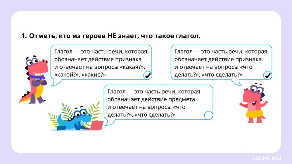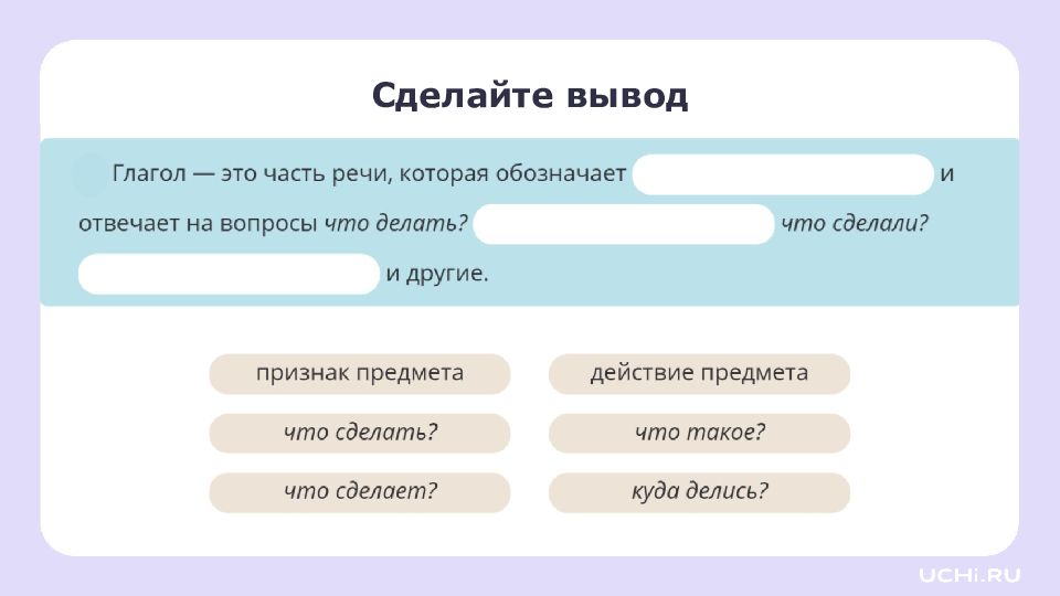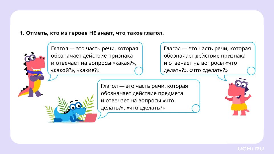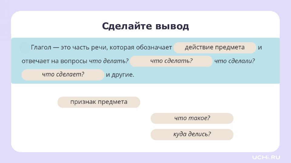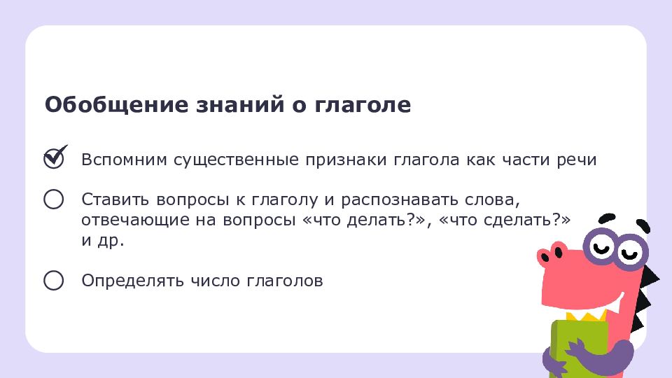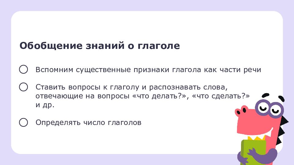 Обобщение знаний о глаголе Вспомним существенные признаки глагола как части речи Ставить вопросы к глаголу и распознавать слова, отвечающие на вопросы «что делать?», «что сделать?» и др. Определять число глаголов
