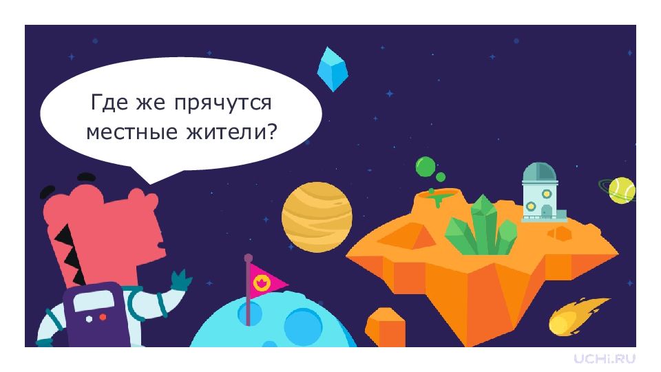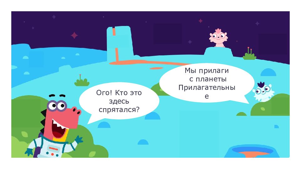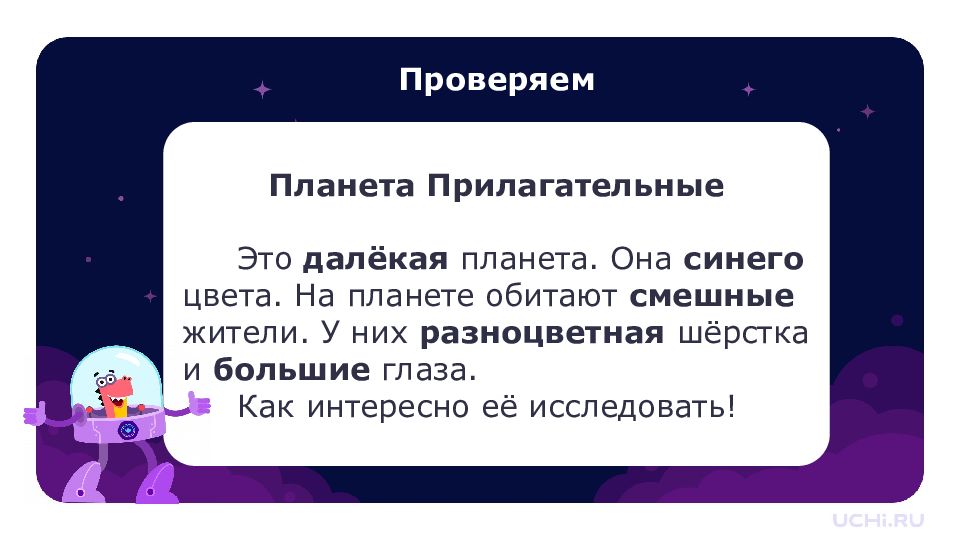 Планета Прилагательные Это далёкая планета. Она синего цвета. На планете обитают смешные жители. У них разноцветная шёрстка и большие глаза. Как интересно её исследовать! Проверяем