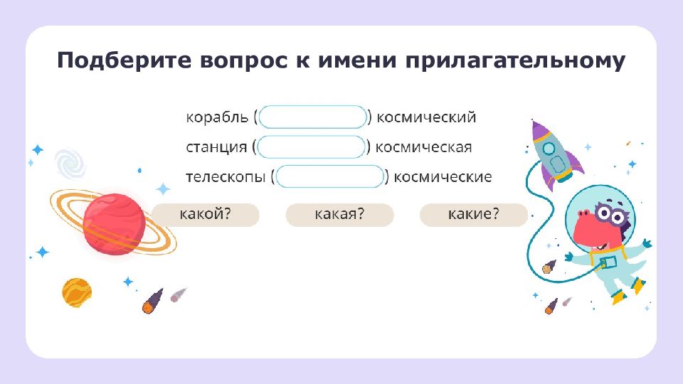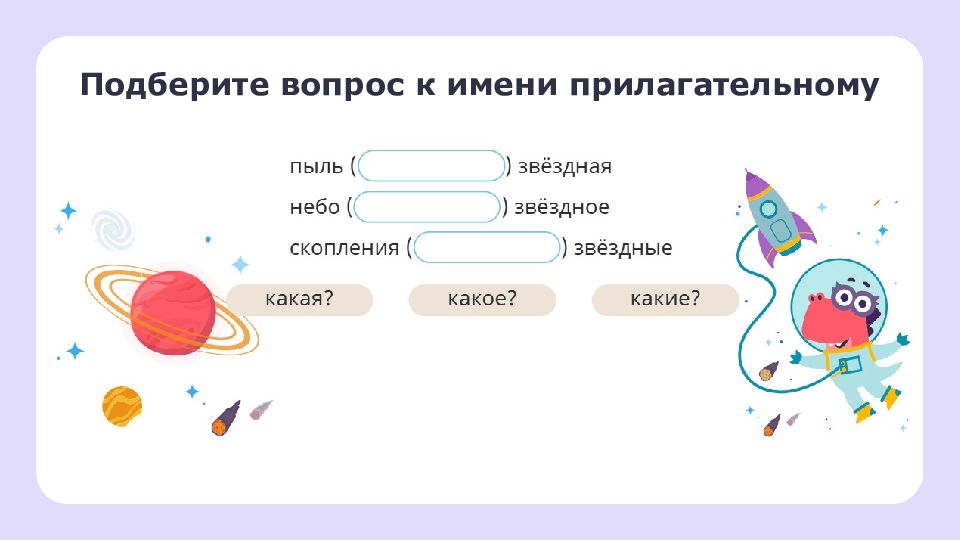 Планета Прилагательные Это планета. Она цвета. На планете обитают жители. У них шёрстка и глаза. Как интересно её исследовать! Вставьте имена прилагательные в нужной форме