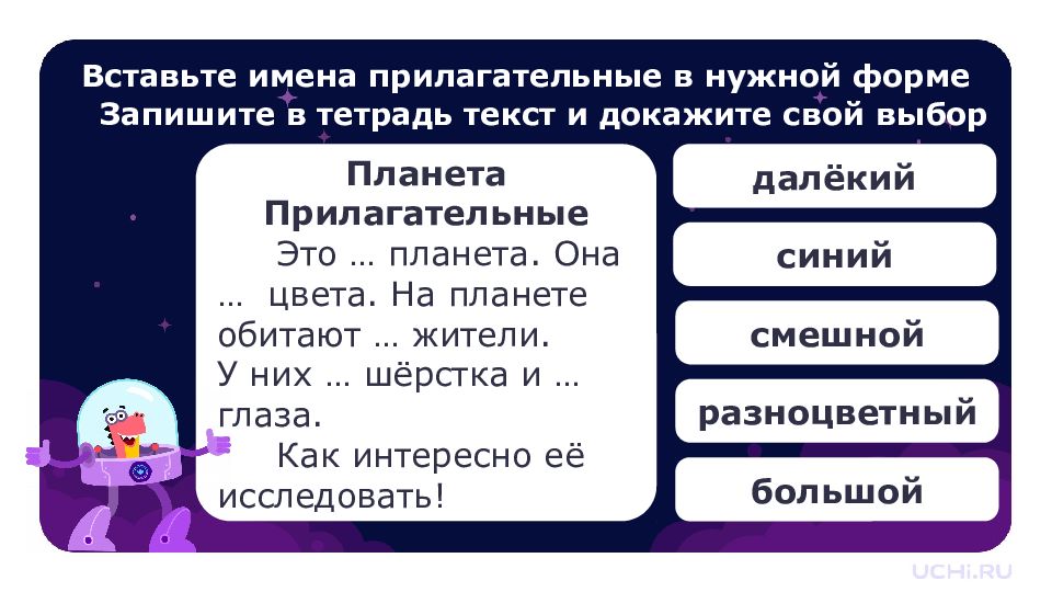Планета Прилагательные Это … планета. Она … цвета. На планете обитают … жители. У них … шёрстка и … глаза. Как интересно её исследовать! далёкий синий смешной разноцветный большой Запишите в тетрадь текст и докажите свой выбор Вставьте имена прилагательные в нужной форме