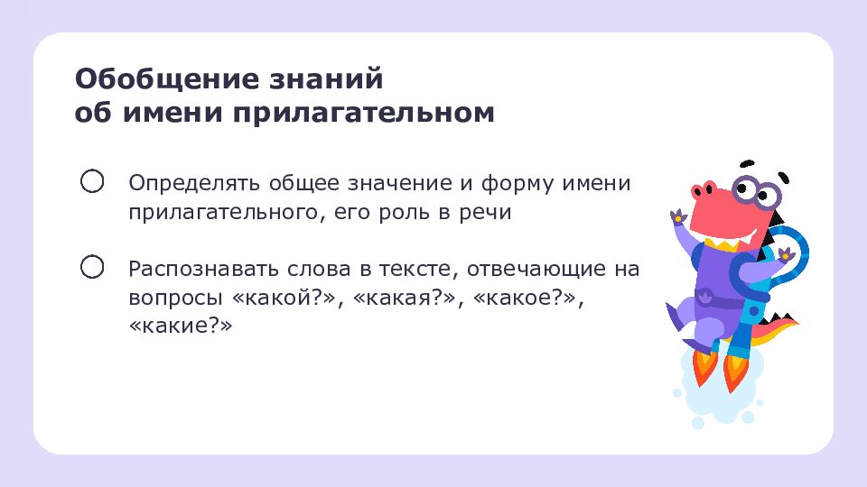 Обобщение знаний об имени прилагательном Определять общее значение и форму имени прилагательного, его роль в речи Распознавать слова в тексте, отвечающие на вопросы «какой?», «какая?», «какое?», «какие?»