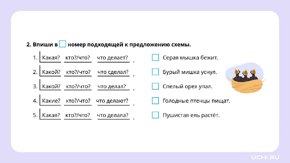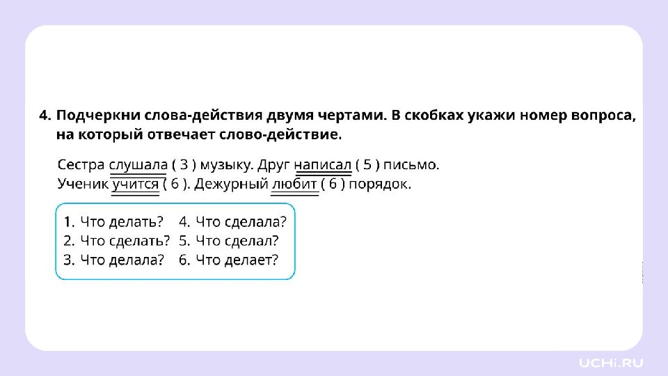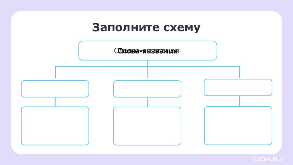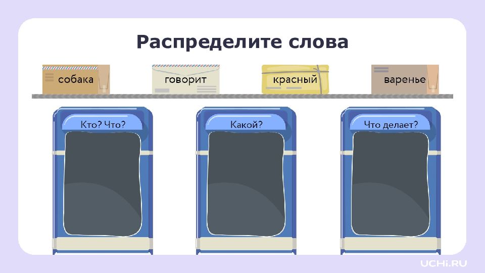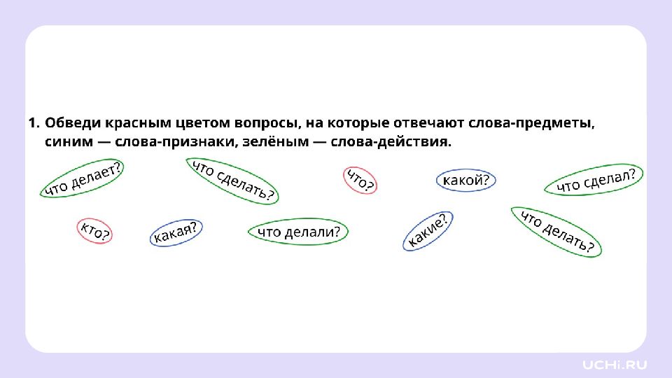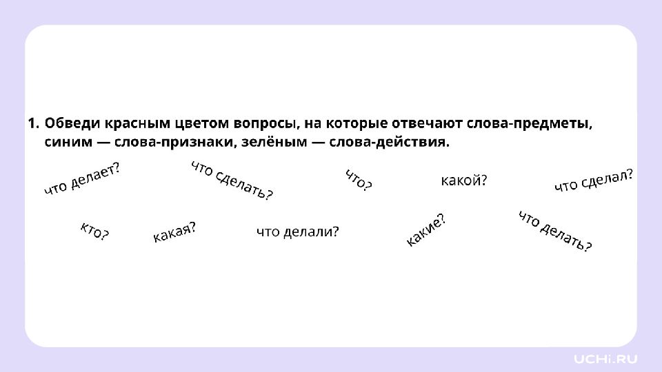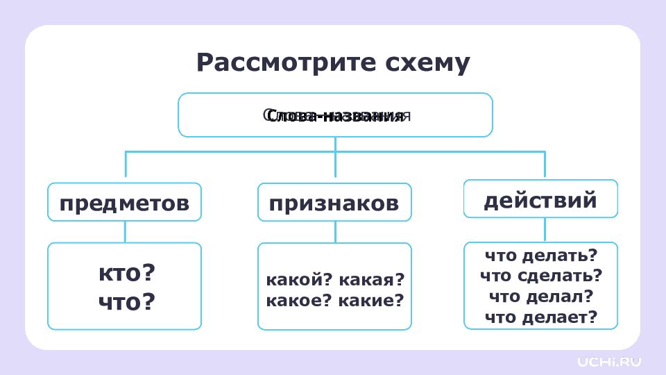 Рассмотрите схему Слова — названия предметов признаков действий кто? что? какой? какая? какое? какие? что делать? что сделать? что делал? что делает?