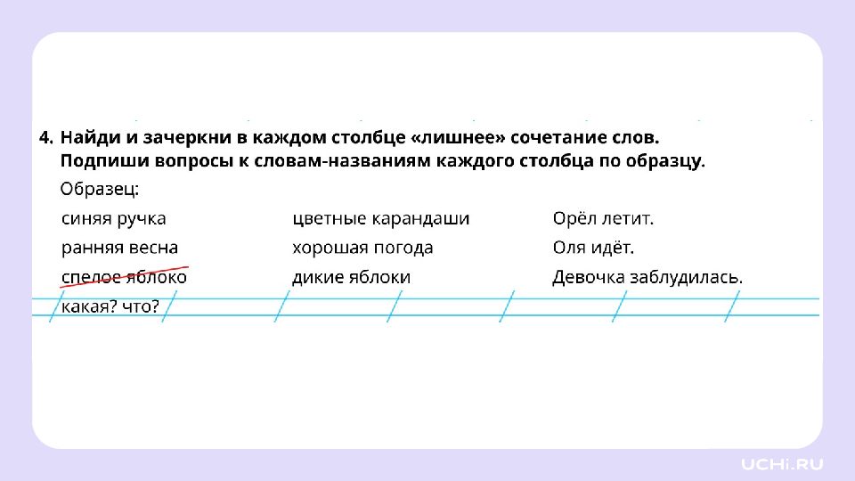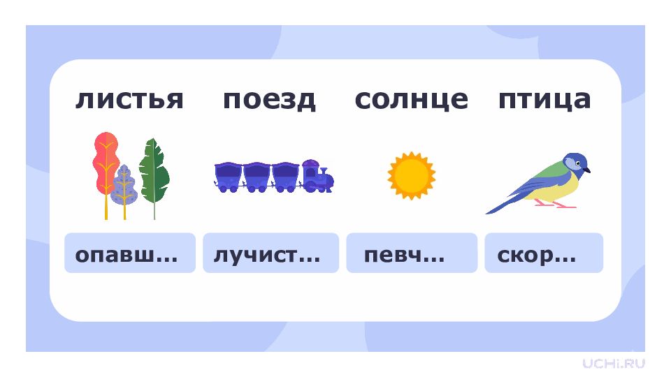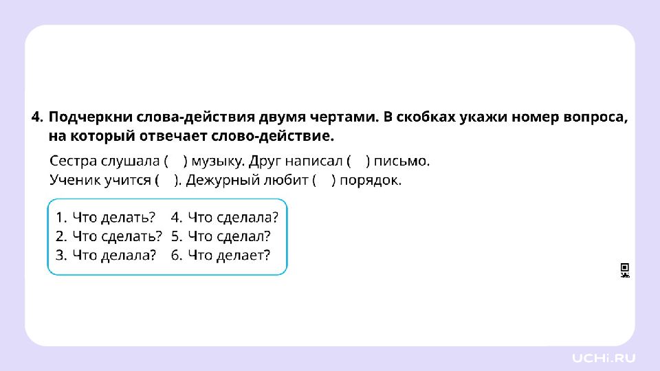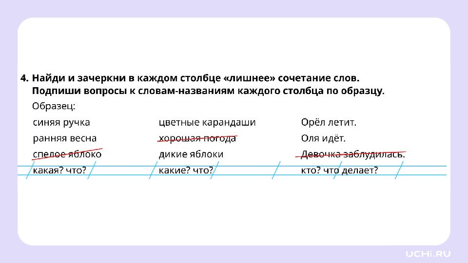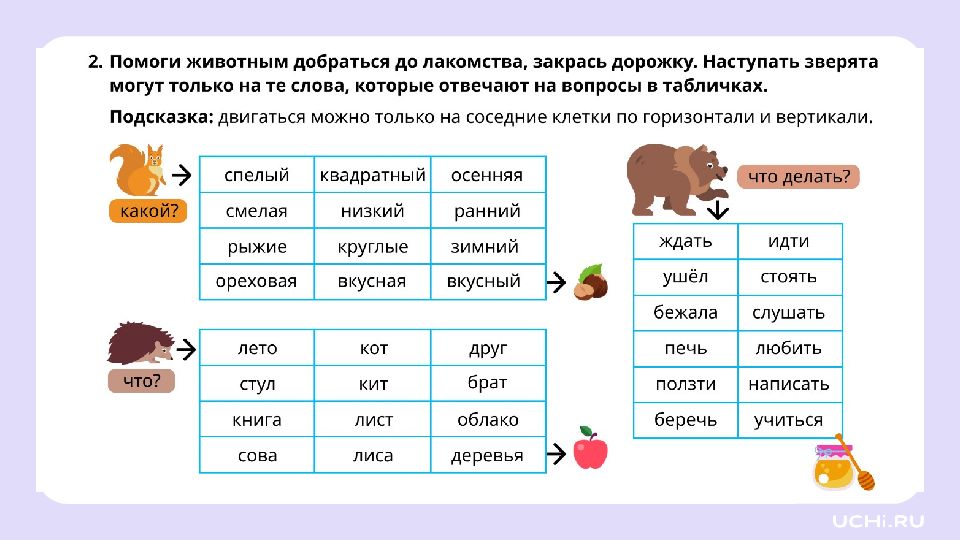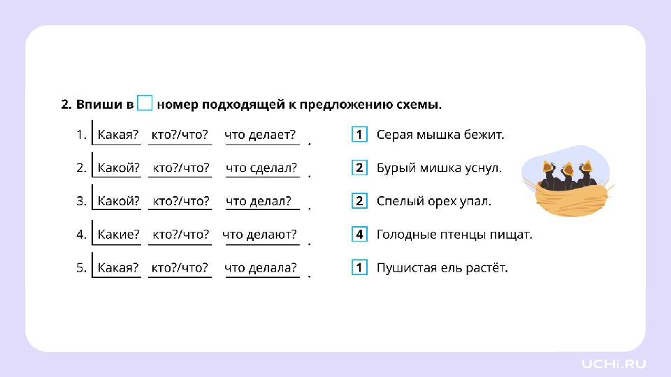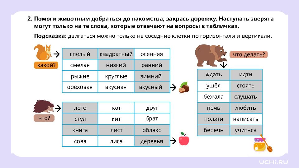 Рассмотрите схему Слова — названия предметов признаков действий кто? что? какой? какая? какое? какие? что делать? что сделать? что делал? что делает?