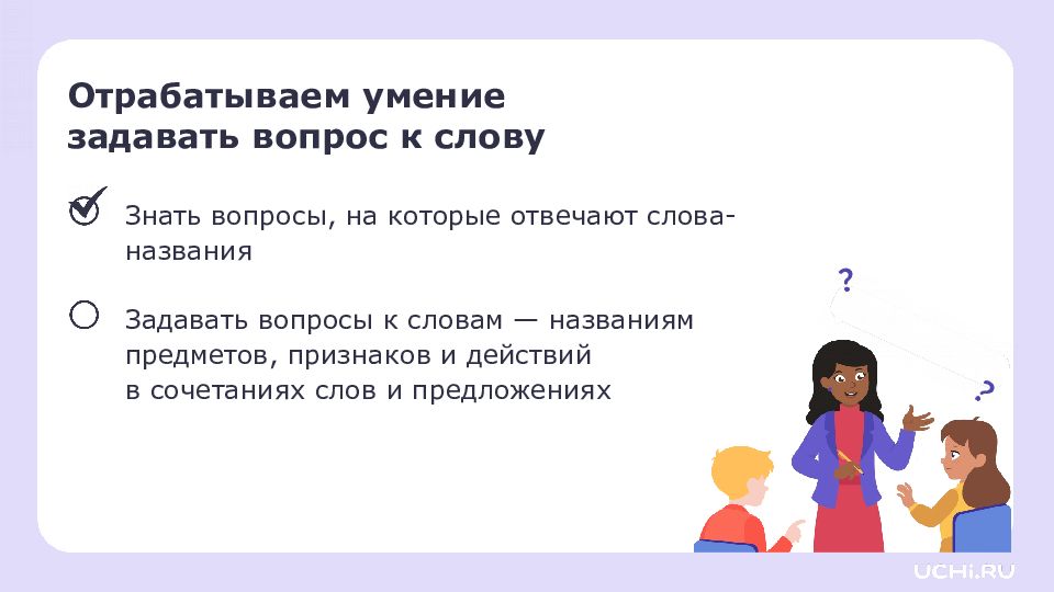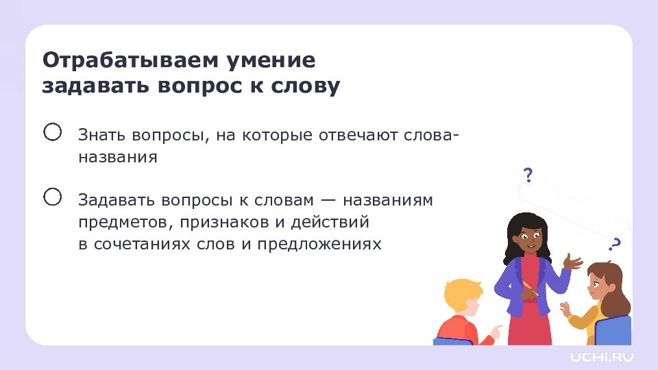Отрабатываем умение задавать вопрос к слову Знать вопросы, на которые отвечают слова-названия Задавать вопросы к словам — названиям предметов, признаков и действий в сочетаниях слов и предложениях
