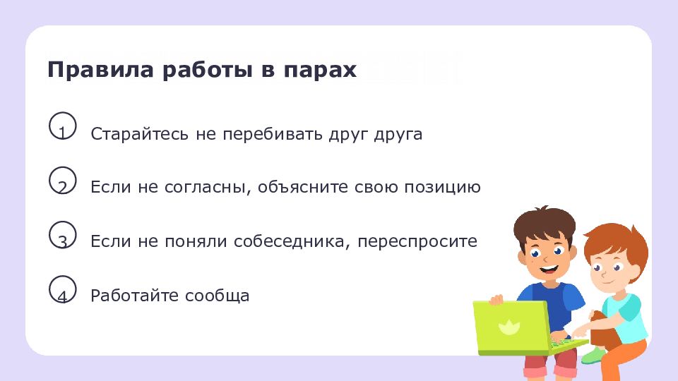 Правила работы в парах Старайтесь не перебивать друг друга Если не согласны, объясните свою позицию Если не поняли собеседника, переспросите Работайте сообща 1 2 3 4