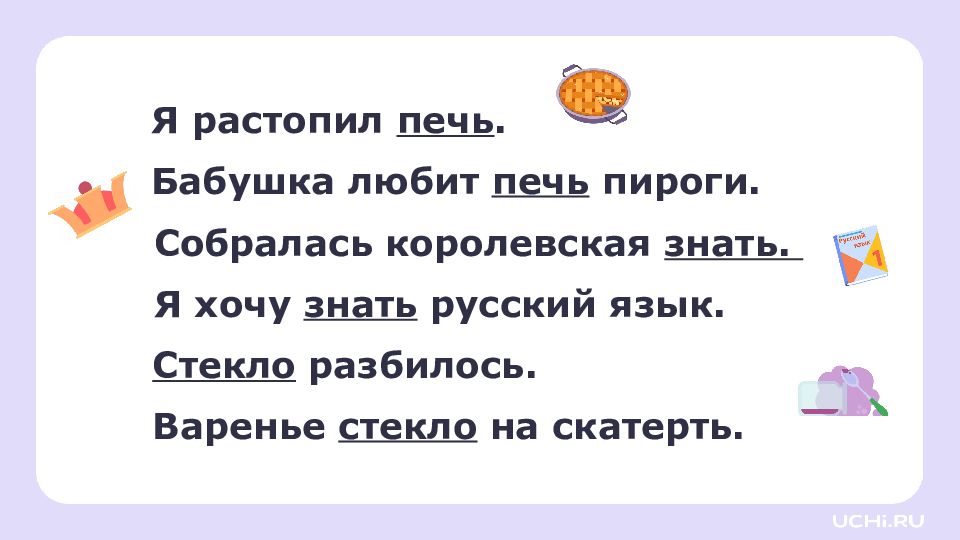 Стекло разбилось. Варенье стекло на скатерть. Собралась королевская знать. Я хочу знать русский язык. Я растопил печь. Бабушка любит печь пироги.